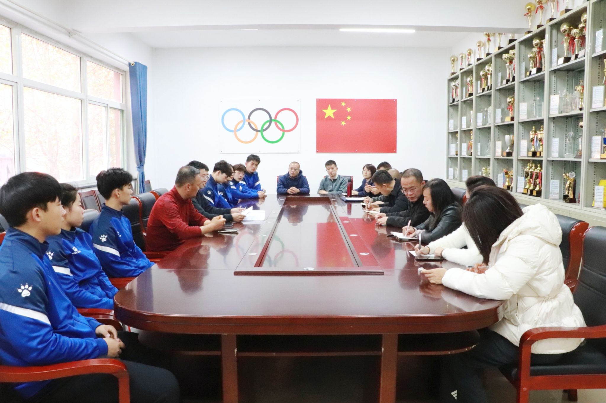 首先,系副主任、集训负责人李昆龙向与会领导及教师汇报近两月训练与学习情况。他表示,队员们在基础理论(笔试)、教学技能(微课)、运动技能(专项)、教练技能等方面,通过日常测试与训练积极进取、精益求精,已取得良好成绩,期望全体队员在此次比赛中取得优异成绩,充分展现长治学院体育系的精神风貌。