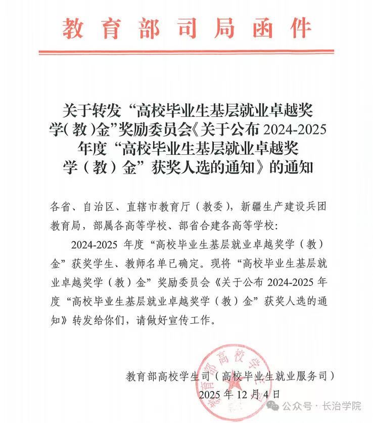 一直以来,我校高度重视毕业生基层就业工作,始终坚持将就业育人贯穿人才培养全过程,通过强化思想引领、完善政策护航、优化服务保障、选树先进典型等举措,引导学子牢固树立 “扎根基层、建功立业” 的职业理想。近年来,一大批长院毕业生奔赴基层一线,在乡村振兴、基础教育、民生服务等领域锤炼成长,以实际行动诠释使命担当。下一步,学校将继续加强就业育人体系建设,发挥榜样示范带动作用,引领更多学子奔赴基层一线、服务国家战略,为区域经济社会高质量发展添砖加瓦,推动学校基层就业工作再上新台阶。